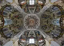The core nucleus consists of a large central oval hall from which the four wings depart, which the royal apartments and those for guests. The large double-height oval hall with balconies concave-convex, is covered by dome surmounted by the statue of the "Cervo", by Francesco Ladatte. With the departure of Juvarra from Turin, the Prince Charles Emmanuel III entrusted the direction of the work to Giovanni Tommaso Prunotto, who provided for the expansion of the building starting from the sketches left by Juvarra, thus trying to safeguard the complex play of lights and shapes. The interior is in Italian Rococo, made of precious materials such as lacquers, porcelains, gilded stuccos, mirrors and roots that today extend on an area of about 31,000 square meters, while 14,000 are occupied by adjacent buildings, 150,000 by the park and 3,800 by the external flowerbeds; Overall, there are 137 rooms and 17 galleries. Among the fine furniture made for the building should be mentioned those of the carver Giuseppe Maria Bonzanigo, Pietro Piffetti and Luigi Prinotto. The building preserves decorations by the Venetian painters Giuseppe and Domenico Valeriani, by Gaetano Perego, and by the Viennese Christan Wehrlin. The frescoes by Vittorio Amedeo Cignaroli, Gian Battista Crosato and Carlo Andrea Van Loo are also noteworthy.