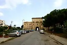 The Palazzo Forcella de Seta is an eclectic-style aristocratic palace located facing the Mediterranean in the ancient quarter of Kalsa of central Palermo, region of Sicily, Italy. The palace was built atop the base of the former defensive walls of the city, including the Vega bastion and in its center, an original city gate, Porta dei Greci (1553) through which via Romano Giuseppe runs through. Some refer to the entire structure as the gate. To the seaside, stretches part of the park Foro Italico. In front of the Northeast corner, in front of the seaside facade, is the Monument to Vincenzo Florio Sr..