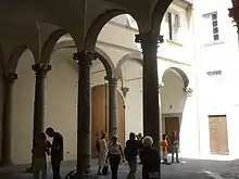 The palace contains an off-center court (three sides of which originally were surrounded by arcades), built to a design that may have been adapted from Brunelleschi's loggia at his Spedale degli Innocenti. In the triangular Piazza dei Rucellai in front of the palace and set at right angles to it is the Loggia de' Rucellai, which was used for family celebrations, weddings, and as a public meeting place. The two buildings (palace and loggia) taken together with the open space between them (the piazza), form one of the most refined urban compositions of the Italian Renaissance.