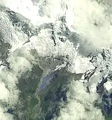 The water volume of Lake Palcacocha has increased significantly in recent years. According to a study by the University of Texas at Austin, the city of Huaraz faces a high risk of flooding from the lake.[5] The volume has grown 34 times since 1970, leading to the declaration of several states of emergency.[6] At the same time, the population of Huaraz has increased from 25 000 in 1941 to around 100 000, many of whom live in the area that was previously flooded.