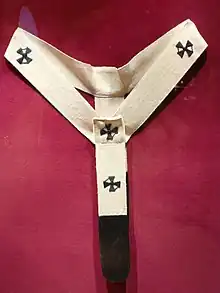In its present (western) form, the pallium is a long and "three fingers broad" (narrow) white band adornment, woven from the wool of lambs raised by Trappist monks. It is donned by looping its middle around one's neck, resting upon the chasuble and two dependent lappets over one's shoulders with tail-ends (doubled) on the left with the front end crossing over the rear. When observed from the front or rear the pallium sports a stylistic letter 'y' (contrasting against an unpatterned chasuble). It is decorated with six black crosses, one near each end and four spaced out around the neck loop. At times the pallium is embellished fore, aft, and at the left shoulder with three gold gem-headed (dull) stickpins. The doubling and pinning on the left shoulder likely survive from the (simple scarf) Roman pallium.[1]