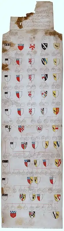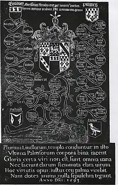 The will of Brian Palmes, Sergeant-at-Law, of Naburn Hall, was dated 31 October 1519. It shows that in addition to Naburn the family held estates in: Riccall, Escrick, South Duffield, Elvington, Barthorpe, Sutton, Holtby, Berrythorpe and Gate Fulford.[6] A cadet branch of the family was seated at Lindley Hall, North Yorkshire, and an Irish line of the family settled at Carcraig.[7]