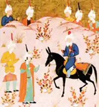 A late 16th century Persian miniature, Safavid period, representing Ibn 'Arabi on horseback with two students.