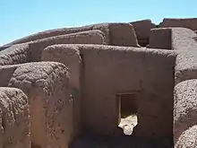 The settlement featured T-shaped doorways and stone disks at the bottom of ceiling support columns, both distinctive of Puebloan architecture. Casas Grandes had ballcourts, though they were relatively small compared to other major sites.[11] The ballcourts at Paquime are in the classic "I" shape of those found Mesoamerica, and not the oval-shaped ones found in association with the Hohokam culture in south and central Arizona.[12]
