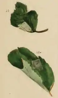 Apple leaf with mine of young larva (2b); another apple leaf with a mine of a young larva, and with its lower parts drawn together by a web spun by the adult larva near the petiole