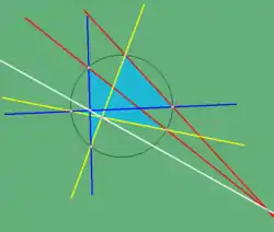 A degenerate case of Pascal's theorem (four points) is interesting; given points ABCD on a conic Γ, the intersection of alternate sides, ABCD, BCDA, together with the intersection of tangents at opposite vertices (A, C) and (B, D) are collinear in four points; the tangents being degenerate 'sides', taken at two possible positions on the 'hexagon' and the corresponding Pascal line sharing either degenerate intersection. This can be proven independently using a property of pole-polar. If the conic is a circle, then another degenerate case says that for a triangle, the three points that appear as the intersection of a side line with the corresponding side line of the Gergonne triangle, are collinear.