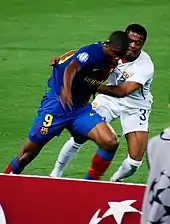 Following the season, Evra was recruited by Nice's Derby de la Côte d'Azur rivals Monaco. Despite wanting to play as a left winger again, Evra was advised by manager Didier Deschamps he would only play as a left-back; Evra has since credited Deschamps for allowing him to become a better defender after initially describing the role as being not fun.[35] Evra was inserted into a back four that consisted of centre-backs Rafael Márquez and Sébastien Squillaci and right-back Franck Jurietti. Evra was assigned the number 3 shirt and made his debut for the club in the opening match of the 2002–03 season against Troyes. He played the entire match in a 4–0 win.[36] On 28 September, Evra scored his first goal for the club, scoring the match-winner in a 2–1 victory against Rennes.[37] On 22 March 2003, he scored his second goal of the season in a 3–0 away win over Le Havre.[38] The victory allowed Monaco to maintain its position at the top of the table, as the club was in a three-way battle with Lyon and Marseille.[39] Monaco climactically conceded first place to Lyon in May, which resulted in Lyon being declared champions for the second time in its history.[40] Monaco finished the campaign in second place, which merited the club an appearance in the UEFA Champions League.[41] The club was also rewarded domestically for its performance in the Coupe de la Ligue where it reached the final. Evra featured in the team's 4–1 win over Sochaux in the match.[42] The league cup title gave Evra the first major honour of his career.