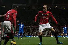 Prior to the start of the 2008–09 season, on 18 July 2008, Evra was charged with four separate counts of improper conduct by the FA.[108] The charges were related to an incident that occurred during the 2007–08 season when Evra had an altercation with a Chelsea groundsman during a warm-down following a match on 26 April. The defender denied the charges and was supported by several members of the club's staff, who commented that the player was racially abused by the groundsman prior to the confrontation.[109][110] Evra remained free to play for United up to the date of the hearing despite the charges being made in July 2008. He began the campaign in similar fashion to the previous season as Manchester United won the Community Shield following the team's 3–0 victory over Portsmouth on penalties.[111] Evra was ever-present in Manchester United's first 22 competitive matches of the season, starting 19 of them.[4] At the hearing on 5 December, Evra was found guilty of improper conduct, and handed a four-match ban – due to start on 22 December 2008 – and a £15,000 fine.[112]