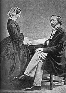 Pauline had also been very friendly with Ruskin's wife Effie, but took Ruskin's side when their marriage was annulled in 1854 and subsequently shunned Effie's attempts to maintain contact with her. The previous summer the Ruskins had spent a protracted artistic holiday in the Scottish Highlands with the Pre-Raphaelite painter John Millais and his brother William. En route to Scotland the party stayed with the Trevelyans at Wallington. Pauline noticed that Ruskin and Effie (whose unconsummated marriage was under great strain) spent most of their time apart, but also seems to have been put out by Effie's flirtatious behaviour with John Millais and their lengthy absences together from the house.[6] Even so, she was complimentary about Effie's appearance at an evening party at which she wore flowers in her hair, a stylistic trait that subsequently irritated Ruskin, came to the disapproving notice of Florence Nightingale,[7] and inspired a painting by Millais ("Effie with Foxgloves in her Hair", 1853), whom Effie married in 1855.