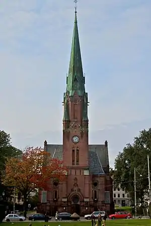 Paulus Church (Norwegian: Paulus kirke; tr. Paul's Church or St. Paul's Church) is a church which was consecrated in 1892, located in Grünerløkka in Oslo, Norway, just opposite the Birkelunden Park. The church is made of brick with a weak front running cross-arms and has about 500 seats. It is inspired by German Gothic style and has a high narrow tower above the entrance, which faces east. Paul's Church was designed by the architect Henrik Bull in 1889, and restoration of the church were made in 1917-18 and in 1972.[1]