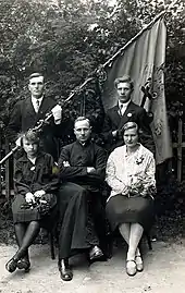 The organization was abolished after the Soviet occupation in June 1940. The Soviets persecuted the organization: its chairman Juozas Leimonas was arrested already in July 1940, three members were killed in the Rainiai massacre and two in the Chervyen massacre.[9] Pavasarininkai also joined the anti-Soviet June Uprising.[10] As a result, many items related to pavasarininkai were destroyed by the Soviet regime. For example, ten flags of local pavasarininkai groups at the Samogitian Museum "Alka" were slated for destruction, but were secretly preserved by museum employees.[11]