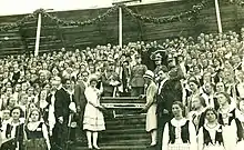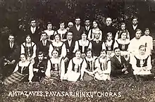 In 1928, pavasarininkai received a letter from Pope Pius XI encouraging their activities.[4] In 1933, it was reorganized into a federation that united separate societies of men, women, and youth (ages 13–16). Local groups were also split by gender. The youth union was dropped in 1937.[5] A separate organization Vyčiai (Knights) for urban Catholic youth was merged into Pavasaris in 1935.[8] The 25th anniversary conference in June 1938 (delayed a year due to issues obtaining permits) was attended by as many as 45,000 people, including about 7,000 sports competitors and 6,000 singers in 247 choirs.[7]