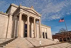 The Classical Revival building features ionic columns, a pediment, egg-and-dart moldings, with high relief panels on its wings.[4] The main façade is closely styled after the north porch of the Erectheion on the Acropolis in Athens, Greece.[4][3]