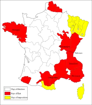 Under the Ancien Régime, a pays d'états (French pronunciation: [pei deta]) was a type of généralité, or fiscal and financial region where, in contrast to the pays d'election, an estates provincial or representative assembly of the three orders had retained its traditional role of negotiating the raising of taxes with the royal commissaires or intendants, dividing the tax burden by diocese and parish, and controlling tax collection. The estates also held onto part of the funds thus raised to repair and develop the roads in its province.