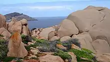 Sixthly, a herbfield featuring both karkalla and Austral stork's bill and fringed with round-leaved pigface is found on “the thinnest, most exposed soils on top of granite outcrops fronting the sea”.
