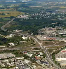 A short distance north of former Highway 53, which is now known as Brant County Highway 53, Highway 24 encounters an interchange with Highway 403 (Exit 27) south of Paris.[3] The route joins concurrently with Highway 403 for 9 kilometres (5.6 mi) east into Brantford. Highway 24 splits from Highway 403 to resume its northward orientation at the King George Road interchange (Exit 36). The highway is maintained under a Connecting Link agreement for 2.2 kilometres (1.4 mi) north of Highway 403, serving as a principal business route through the northern portion of the city.[1][4] Between Brantford and Cambridge, Highway 24 is a busy two lane rural highway that has played host to frequent collisions, prompting a Ministry of Transportation of Ontario (MTO) investigation into possible upgrades to the stretch.[5]