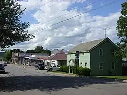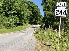 PA 244 begins at an intersection with PA 44 in the community of Coneville in Hebron Township, heading east-northeast on a two-lane undivided road. The road runs through a narrow valley with some agriculture and homes parallel to the Oswayo Creek, entering the borough of Oswayo. At this point, the route becomes Main Street and passes a few homes before crossing into Oswayo Township. PA 244 heads east on Rose Lake Road through hilly forested areas, turning southeast and briefly entering Genesee Township before continuing into Allegany Township. The route heads east into agricultural areas and turns north onto Andrews Settlement Road in the community of Andrews Settlement.[2][3]