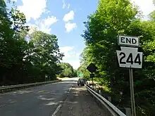 Most of PA 244's route was paved in 1931[1] and was signed by 1941.[4] Originally, PA 244 ended at PA 449 in Genesee, but by 1982 it was extended east across the Genesee River to the New York state line.[5] In 2003, the School Street Bridge carrying PA 244 across the Genesee River was closed due to its age and deteriorating conditions.[6] This closure forced PA 244 to share a short concurrency with PA 449 and SR 1010 in Genesee. In 2011, a new bridge opened returning PA 244 to its original alignment.[6]