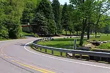 In the community of Shawanaese, where PA 415 darts to the south along the western lakeside, SR 1415 (also signed as PA 415) heads along the eastern side of the lake. The route heads northward along Lakeside Drive, passing through the wealthy communities. Paralleling its sister route across shores, SR 1415 heads through a large populous area, serving several access roads to and from the lake. Compared to its sister route, which went straight for most of its distance, the eastern roadway curves along the lake more often. The route continues, turning eastward along the hammer-shaped shoreline of Harveys Lake. After an intersection with Carrie Street, SR 1415 reaches a large hairpin turn along the easternmost portion of Harveys Lake, passing several local tennis courts and intersecting with local roads. The route heads westward along Lakeside Drive, entering the community of Harveys Lake, which is populous on the northern side of the lake. After passing a plethora of lakeside homes, SR 1415 intersects with the PA 415 mainline and ends in Harveys Lake.[2] SR 1415 is 3.843 miles (6.185 km) long.[1]