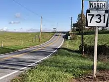 PA 731 begins at an intersection with PA 484 in the rural farmlands of Union Township.[2] The highway, locally known as Fairview Road, progresses northeast and intersects with Zach's Ridge Road for the first time. Here, the highway turns left.[2] After passing through a small wooded area, PA 731 comes to another intersection with McKees Gap Road, at which point it makes a right turn.[2] The route now turns due east, and the woods break up at this point. A short distance later the road comes to the northern end of Zach's Ridge Road and soon after that Henderson Road, which is a long connector back to PA 484. Immediately after this, PA 731 comes to its terminus at an interchange with I-70.[2] I-70 goes south towards the Pennsylvania / Maryland border and north to the Pennsylvania Turnpike.[2]