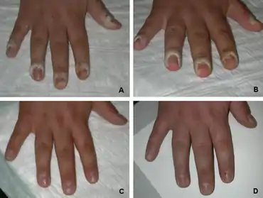 Periungual warts are warts that cluster around the fingernail or toenail. They appear as thickened, fissured cauliflower-like skin around the nail plate. Periungual warts often cause loss of the cuticle and paronychia. Nail biting increases susceptibility to these warts.[1]