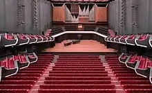 View of the auditorium from back stalls towards the stage and organ.