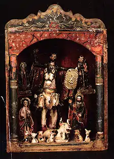 Retablos came to the New World as small portable altars, Nativity scenes and other religious topics used by the early priests to evangelize the Indigenous.