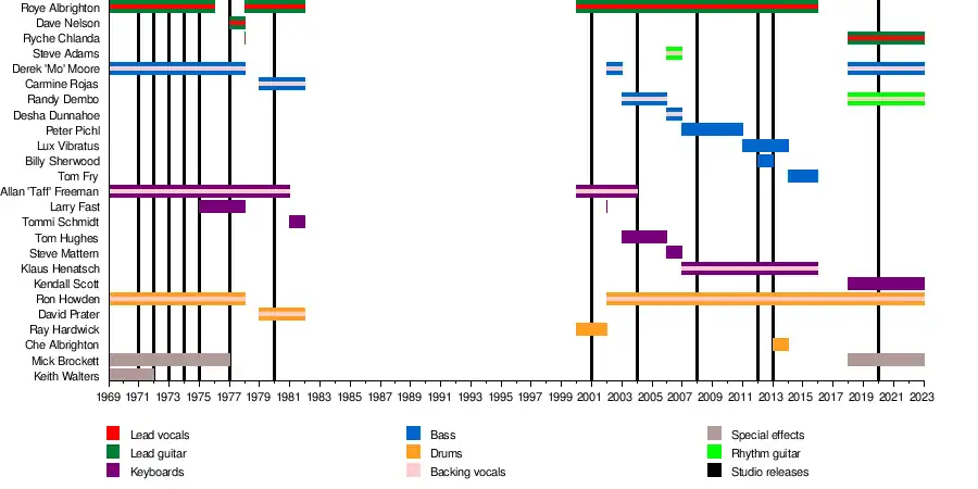 - Mick Brockett – special effects, lyrics (1969–1977, 2002, 2019–present)