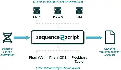 Sequence2Script is a "free online tool to help healthcare providers and clinical laboratories translate pharmacogenetic test results into clinically useful recommendations."[27][28] This tool "creates a report that outlines medication and dosing recommendations based on a patient’s known genotypes. The recommendations made by this tool are based on expert, peer-reviewed guidelines developed by the CPIC, the Dutch Pharmacogenetics Working Group (DPWG), and US Food & Drug Administration (FDA). All you need to do is enter the patient’s known genetic information and any medications they are currently taking, and Sequence2Script will compile the recommendations from these sources into a single report that can be reviewed online or printed out."