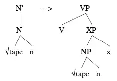 Syntactic decomposition for categorization of parts of speech includes an explanation for why some verbs and nouns have a predictable relationship to their nominal counterparts and why some don't. It says that the predictable forms are denominal and that the unpredictable forms are strictly root-derived.[30] The examples provided are of the English verbs hammer and tape. A verb such as hammer is a root-derived form, meaning that it can appear within an NP or within a VP. A denominalized verb, such as tape must first be converted from an NP because its meaning relies on the semantics of the noun.[31]