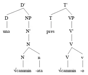 This analysis states that the category is determined by syntax or context. A root word is inserted into the syntax as bare and the surrounding syntax determines if it will behave as a verb or a noun. Once the environment has determined its category, morphological inflections also surface on the root according to the determined category. Typically, if the element before it is a determiner, the word will surface as a noun, and if the element before it is a tense element, the root word will surface as a verb.[29] The example in the photo shows an example from Italian. The root of the word is cammin- ("walk"). This word could surface as either a noun or verb. The first tree shows that when the element before is a D "una", the root will be an N and the following morphology will inflect -ata which is the correct full orthography for the noun "walk" in Italian. The tree on the right shows a similar process but in the environment where the root follows a tense element, and the morphology inflects -o as a suffix, which makes the verb surface not only as a verb, but as discussed before in person agreement, also shows that this is the first person present form of the verb ("I walk").