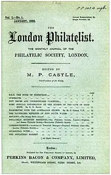 - ↑ "The Royal Philatelic Society, London. 1869 – April 10th – 1929." by Percy de Worms in The London Philatelist, Vol. XXXVIII, No. 447, March 1929, pp. 52–56.