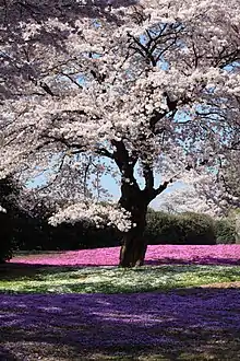 Phlox subulata in an ornamental planting beneath a cherry tree at Yachounomori Garden in Annaka, Gunma