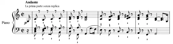 The second movement is a set of variations on a disjunct, chordal theme which is marked "La prima parte senza replica" (first part without repeats). The form of the music is Theme with Three Variations. It seems about to end quietly, like the first and last movements, but then concludes abruptly with a crashing fortissimo C major chord.