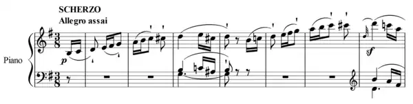 Like the first movement, the third movement opens with an ascending, hesitant, three-note motif that conveys considerable rhythmic ambiguity. In his book, The Music Instinct, the science writer Philip Ball[2] singles out this theme as an example of the classic trick of disguising 'one rhythmic structure as another'. The movement, which is in 3