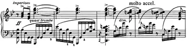 Transition | ![]() Mm. 96–99. Imperioso and sotto voce misterioso affanato motifs. The first features an angular melody over an arpeggiated dominant chord. The second is built on block french sixth chords ![]() Mm. 114–117. Quasi tromba motif, built on an Eb major seventh chord in first inversion. It is followed by a C-dominant ninth chord, that prepares the second theme. |