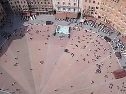 The twice-a-year horse-race, Palio di Siena, is held around the edges of the piazza. The piazza is also the finish location of the annual road cycling race Strade Bianche.