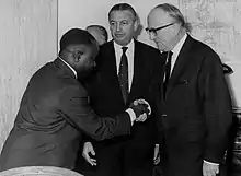 In early 1964 Ngendandumwe went on a regional tour, visiting Kenya, Uganda, and Tanganyika to explore the possibility of Burundi joining the East African Common Services Organization and eventually a proposed East African Federation.[24] He also established diplomatic relations with the People's Republic of China, upsetting the Mwami.[25] On 31 March 1964 the Mwami dismissed four controversial cabinet members and asked Ngendandumwe to create a new government. A settlement was not reached[26] and Ngendandumwe resigned on 6 April 1964.[27] He was replaced by Albin Nyamoya.[26] Despite this, he accompanied the Mwami to the United States in May to meet with President Lyndon B. Johnson.[28]