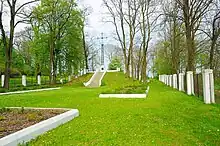 To the north of Pikulice's center, there stands a monument which honors the memory of the soldiers of the Ukrainian Galician Army who participated in the Polish-Ukrainian War of 1918–1919. Polish authorities interned them as prisoners of war at a makeshift camp and detention center located in former Austrian barracks. Several thousand of them died between 1919 and 1920 from outbreaks of typhus and diphtheria. They were buried in mass graves at an Austrian war cemetery. Under communist Poland, this cemetery was destroyed in the 1960s. It was reconstructed in the 1980s.[5] In 2000, 47 former soldiers of the Ukrainian Insurgent Army were exhumed from mass graves in Bircza and reburied at the Ukrainian military cemetery.[6] In a tradition dating back to the 1921, Ukrainians, since 1990, hold an annual mourning procession from Przemyśl's city center to the Pikulice graveyard on the Sunday after Pentecost.[5][6]