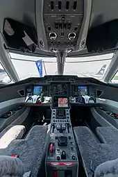 The cabin has room for ten passengers in the cabin and one or two pilots.[41] The cabin has three exits, a passenger door on the left-hand side near the front, overwing emergency exits on each side of the aircraft, and a cargo door on the left-hand side at the rear.[41] Pilatus claims the PC-24 is the first business jet to be fitted with this standard pallet-sized cargo door.[44]