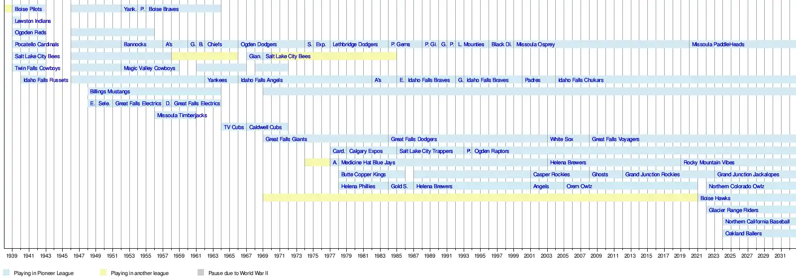 The Pioneer League was established in 1939 as a Class C minor league consisting of six teams from Idaho and Utah. It later expanded to Montana as part of a failed effort in the 1950s to become a third major league rivalling the American and National leagues, complicated by competition with the Pacific Coast League. By the time it was reclassified as a Rookie league in 1964, only four teams in Idaho remained. Gradually, it returned to Montana and Utah, and expanded into Colorado and the Canadian province of Alberta by 1974, and since then has consistently had eight or more teams competing. In 2021, the league became independent, and ceased all MLB team affiliations, reorganizing as an MLB Partner League representing the Western United States market. An expansion into California followed in 2024.