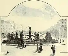 Since 1844, the centre of square has been occupied by a monumental fountain known as the Rouppe Fountain. This monument, the work of Joseph Poelaert, and originally bearing a medallion bust of Rouppe, was inaugurated in 1848. It was inspired by the fountains of the Champs-Élysées in Paris.[2]
