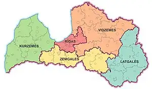 There are five planning regions of Latvia (Latvian: Latvijas plānošanas reģioni) after a 2021 reform: Kurzeme Planning Region, Latgale Planning Region, Riga Planning Region, Vidzeme Planning Region and Zemgale Planning Region. The boundaries of the regions align with the boundaries of the municipalities of Latvia following the municipality reform of 1 July 2009. The planning regions of Latvia are not administrative territorial divisions, since they are not mentioned in the law that prescribes the administrative territorial divisions of Latvia.[1]