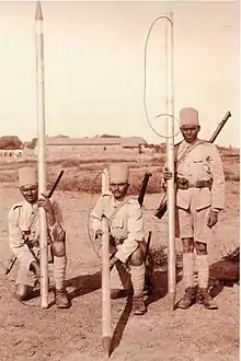 The Bangalore torpedo was devised by Captain R. L. McClintock[2] of the Royal Engineers while attached to the Madras Sappers and Miners unit of the Indian Army at Bangalore, India, in 1912. He invented it as a means of blowing up booby traps and barricades left over from the Second Boer War and the Russo-Japanese War.[3] The Bangalore torpedo could be exploded over a mine, without a sapper having to approach closer than about 3 m (10 ft).