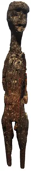 In 1934, the first archaeologically excavated figure was identified during excavations at Lagore crannog, County Meath by Hugh O'Neill Hencken. The figure is one of two explicitly anthropomorphic figures in the corpus, the remainder being more stylized. It is 0.47 m tall and consists of a heart-shaped face, a square torso without arms, and two simple legs ending in feet. A slight bump in the pubic area is interpreted as indicating male genitals.[42] The Lagore figure is the earliest to have been found in Ireland and dates to 2135–1944 cal. BC.
