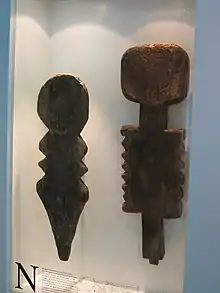The earliest evidence of anthropomorphic wooden cult figures in areas that would later have Germanic-speaking inhabitants is from the Bronze Age. The Broddenbjerg idol, an ithyphallic forked-stick figure found in a peat bog near Viborg, Denmark, is carbon-dated to approximately 535–520 BCE.[2] The Braak Bog Figures, a male and female forked-stick pair found in a peat bog at Braak, Schleswig-Holstein, have been dated to the 2nd to 3rd centuries BCE but also as early as the 4th century.[3][4] In areas with Germanic-speakers, figures have been found in an area extending from Schleswig-Holstein in Germany to Norrland in Sweden,[5] but the vast majority have been preserved in bogs or other moist environments, so it is impossible to know how widespread the practice actually was. One figure has been found on dry land, in a ditch complex on a hillside at Bad Doberan, Mecklenburg-Vorpommern.[6] The great majority of the figurines are markedly more abstract than other artistic artefacts of their time. The 5th-6th century seated figure from the Rude-Eskilstrup bog in Munke Bjergby parish, Zealand, Denmark, is unusually detailed: it has a triple neck-ring or collar, a kirtle and a pronounced chin or beard, and resembles a bronze figure found at Bregneburg on Funen.[7][8][9] It has been suggested that this figure may have stood in a heathen temple and been placed in the bog at the conversion.[10] Furthermore, post holes have been identified such as that which forms the focal point of the "grandstand" at the 6th to 7th-century Anglo-Saxon royal hall site of Yeavering. With a side length of 56 centimetres (22 in) and a depth of approximately 1.2 metres (3 ft 11 in), it indicates a pillar of considerable size, presumably a cult pillar of some sort.[11][12][13]