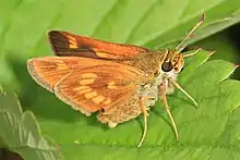 Polites mystic, the long dash or long dash skipper, is a species of butterfly. The species is commonly found in north of North America and in mountains in the south of North America, in grassy habitats.[1] The grassy areas include meadows, marshes, streamsides, wood edges, and prairie swales. On the top, the species has dark brown reddish to yellowish-orange markings. The forewing of the female has a broad black patch at the base. The forewing of the male has a long, slightly curved stigma which may be connected to the dash near the apex. Underneath the hindwing, the species is orange brown with a curved band of equal-sized yellow spots.[2]