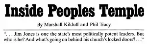 - ↑ Kilduff, Marshall and Phil Tracy. "Inside Peoples Temple." Alternative Considerations of Jonestown and Peoples Temple. Jonestown Project: San Diego State University. August 1, 1977. "Jonestown". Archived from the original on December 17, 2010. Retrieved 2006-10-28.