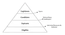 The Political Recruitment Model shows both the roles one takes to become an elected official as well as the barriers that keeps one from moving up the ladder to the next step.[1] The first step, eligibles, are anyone who is legally able to run for political office. Eligibles then turn into aspirants when an eligible has the ambition and desire to hold office. The aspirant group is smaller than the eligible group. An aspirant turns into a candidate when they declare a candidacy and run. The candidate group is smaller than the aspirant pool. The final step in the recruitment model is an elected official.[1]