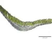 The lamellae, ridges of cells that run along the leaf surface, are crenulate (i.e. with small rounded teeth) in profile and are 5 to 9 cells high. Their margins are distinctly grooved with 2 rows of paired, projecting knobs. The marginal cells, when observed in section, may be narrow, but are more typically enlarged and wider than those beneath. They are retuse (i.e. with a rounded apex with a central shallow notch) to deeply notched, and in rare cases are divided by a vertical partition. These cells are smooth and brownish in colour and have relatively thick cell walls. The sheath cells measure 60 to 90 µm long by 10 to 13 µm wide. These cells may be elongated rectangles or strongly linear structures up to 20 times long as wide. They become narrower toward the margins. Marginal lamina cells are 10 to 15 µm wide and are subquadrate (i.e. nearly square).[3]
